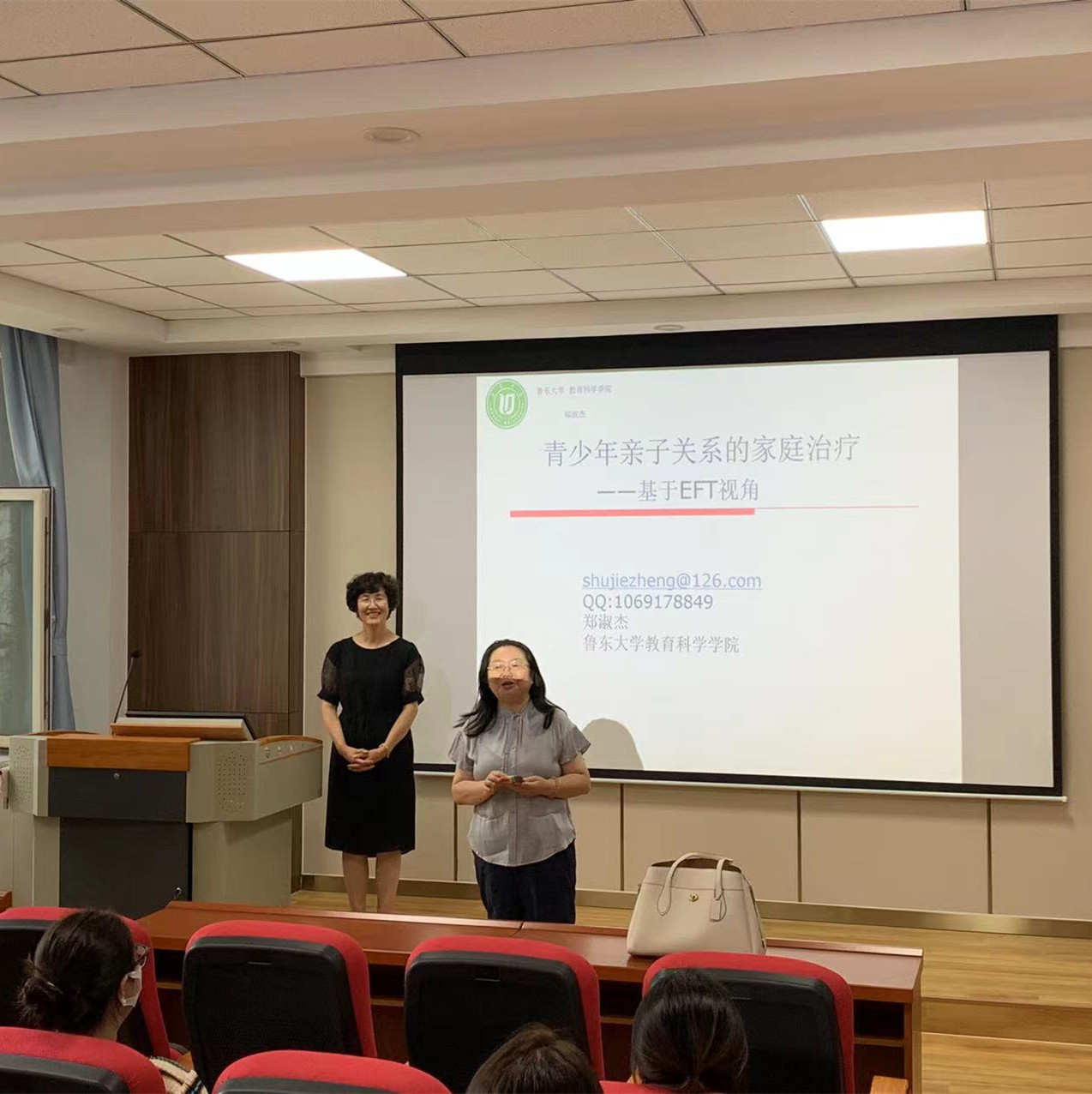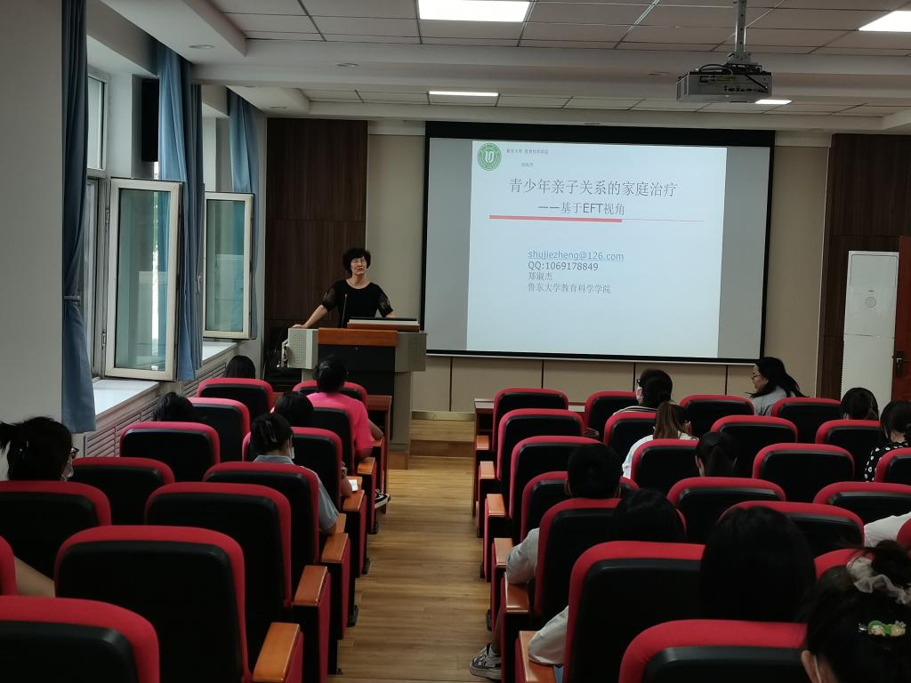 郑淑杰教授以“青少年亲子关系的家庭治疗—基于EFT视角”为题,从理论支持、治疗视角等方面对EFT治疗方式进行了深入、系统的讲解。基于EFT视角,郑淑杰教授介绍了自己及团队对青少年亲子关系开展家庭治疗的科研成果,将EFT三阶段九步骤治疗模型,用生活中的实例予以阐释,全面介绍了如何利用该方法促进亲子间表层情绪和深层情绪的互动。郑教授结合自己咨询实例展示了情绪聚焦疗法的使用方法,向同学们提供了全新的思路及视角。