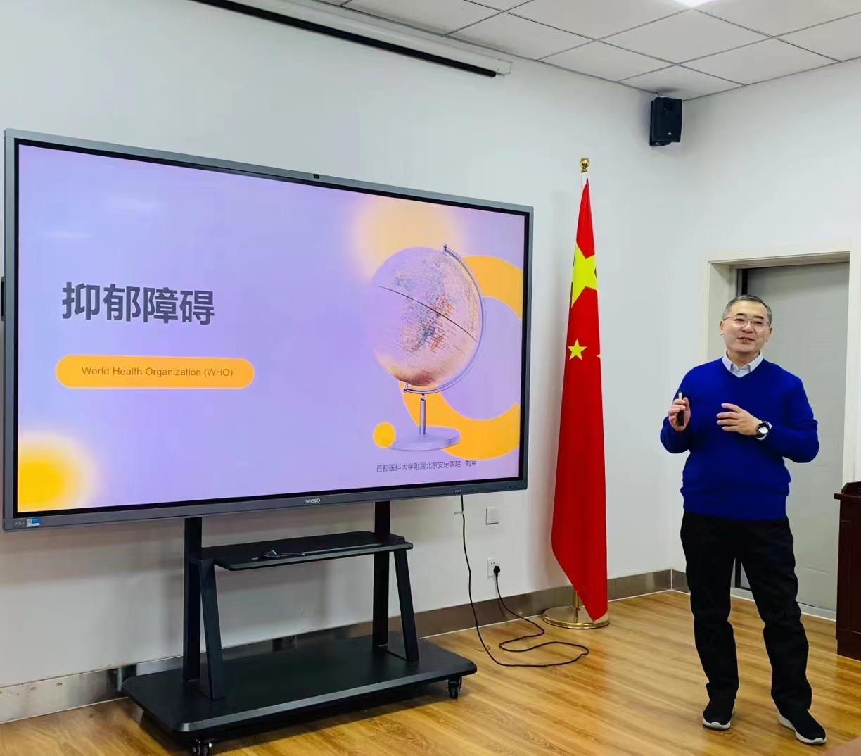 2023年10月20日上午,中国心理学会临床心理学注册工作委员会委员(伦理组)、首批中国心理学会临床心理学注册工作委员会注册督导师(D-06-043)、中国心理卫生协会首批认证督导师(XXD-2020-051)、中国社会心理学会婚姻与家庭心理学专业委员会委员、中国心理卫生协会心理治疗与咨询专委会家庭治疗学组(第三届)委员、中国心理卫生协会性心理健康专委会常委、北京心理卫生协会心理治疗与咨询委员会常务委员刘军老师应邀做客“心理健康大讲堂”,为beat365官网师生做了题为《抑郁障碍——世界卫生组织的应对》的学术讲座。副院长金童林主持讲座。