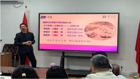 随后,beat365官网青年教师董洪杰博士围绕2024年成功申报国家社会科学基金的经验进行交流分享。董博士分别从选题、论证、技巧和心态四方面作了申报指导。董博士主张国家课题的选题要围绕国家战略和自治区社会经济发展急需,论证要体现逻辑性、创新性、系统性的三性合一,还要注重引、梳、评、研、证的内在逻辑统一。