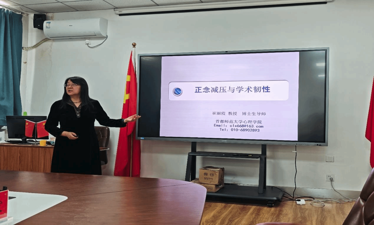 崔丽霞老师以《正念减压与学术韧性》为主题,依托其在临床心理学领域的深厚实践经验,系统阐释了正念的核心、作用原理、价值内涵及应用场景,重点聚焦正念在增强学术韧性方面的积极作用展开深入讲解。报告过程中,崔老师尤为注重理论与实践的结合,主导全体研究生完成了 5 分钟的正念训练实操。训练结束后,崔老师与研究生们围绕正念过程中的注意力迁移特征、心理体验维度等议题,展开了富有建设性的互动研讨。