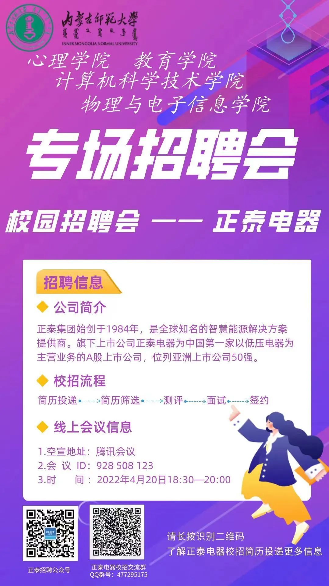 为深入贯彻党中央、国务院“稳就业”“保就业”决策部署,进一步做好毕业生就业工作,拓宽就业渠道,实现高质量就业, 4月20日,beat365正版唯一官网必一通过校友积极联系正泰电器,面向beat365正版唯一官网必一、教育学院、物理与电子信息学院、计算机科学技术学院等召开2022届毕业生线上专场招聘会。