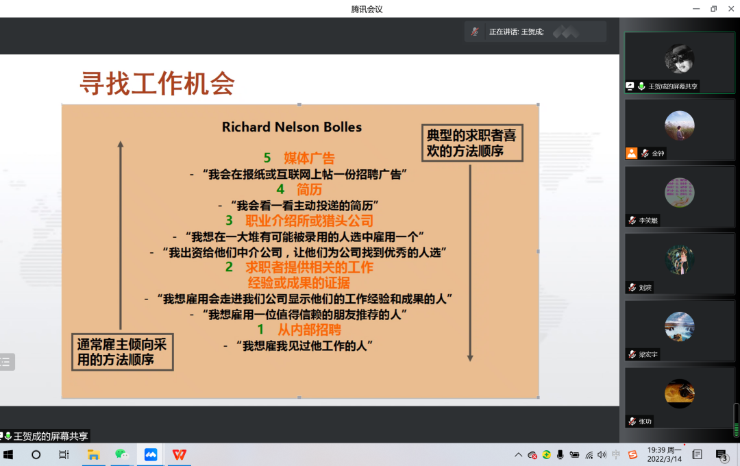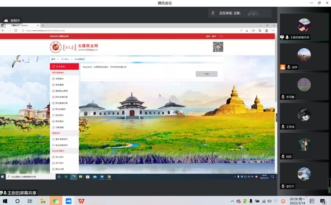 为贯彻党中央、国务院“稳就业”“保就业”决策部署,落实学校就业工作要求,推进beat365官网2022届毕业生就业工作,促进毕业生高质量就业,beat365正版唯一官网必一于2022年3月14日晚特邀请我校招生就业处就业市场部部长刘在青、招生就业处职业发展指导中心主任王贺成、招生就业处就业信息服务中心王新三位老师开展线上就业政策讲座,beat365官网党委书记七十三、院长乌云特娜、副院长侯友、全院教师及2022届毕业生参加讲座,讲座由学院党委副书记副院长张晓阳主持。