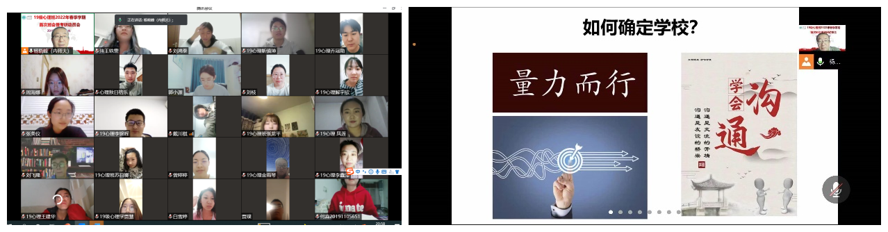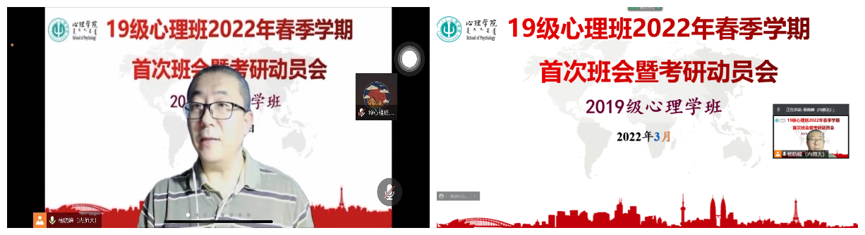 为做好beat365官网2019级学生考研辅导,提前谋划就业工作,推动学生高质量就业, 3月6日,beat365正版唯一官网必一2019级心理班线上召开2022年春季学期首次班会暨考研动员会,2019级心理学本科生53人参加会议,班主任杨晓峰老师主持会议并进行了考研动员及复习指导。