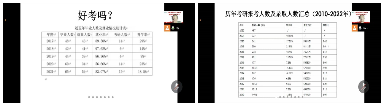 杨晓峰老师通过对近10年全国考研形势以及近五年beat365官网学生考研状况的分析,结合自己的求学经历,要求同学们及早规划、及早动手,尽快根据自己的实际情况制定考研计划,确定目标院校和专业,鼓励同学们保持决心、恒心和平常心对待考研,要从战术上重视、战略上有准备,同学们内部要团结,多沟通交流,相互鼓励。