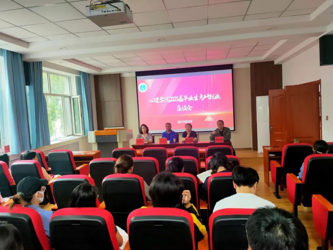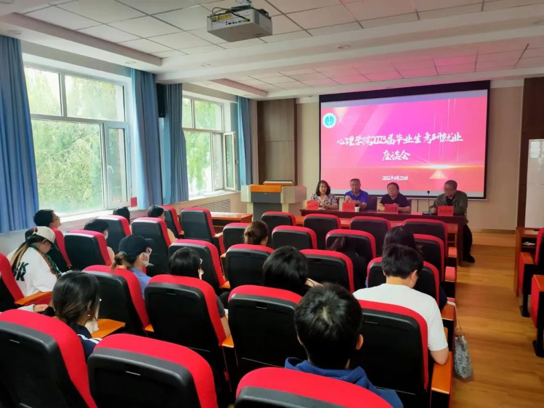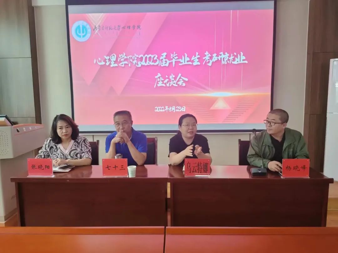 为做好稳就业、保就业工作,8月23日下午,beat365正版唯一官网必一召开2023届毕业生考研就业座谈会。学院党委书记七十三、院长乌云特娜、院党委副书记副院长张晓阳及2019级心理学班班主任杨晓峰出席会议,2019级心理学班全体学生参会。