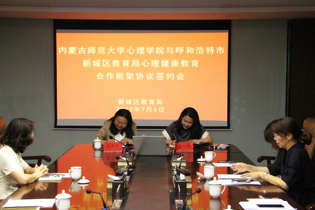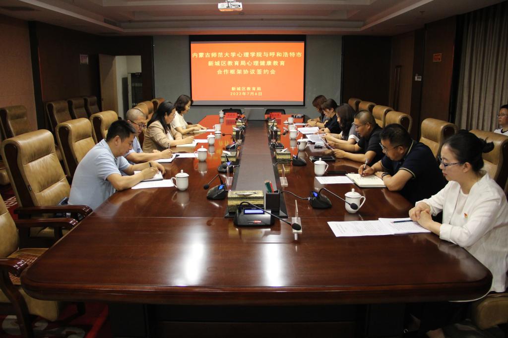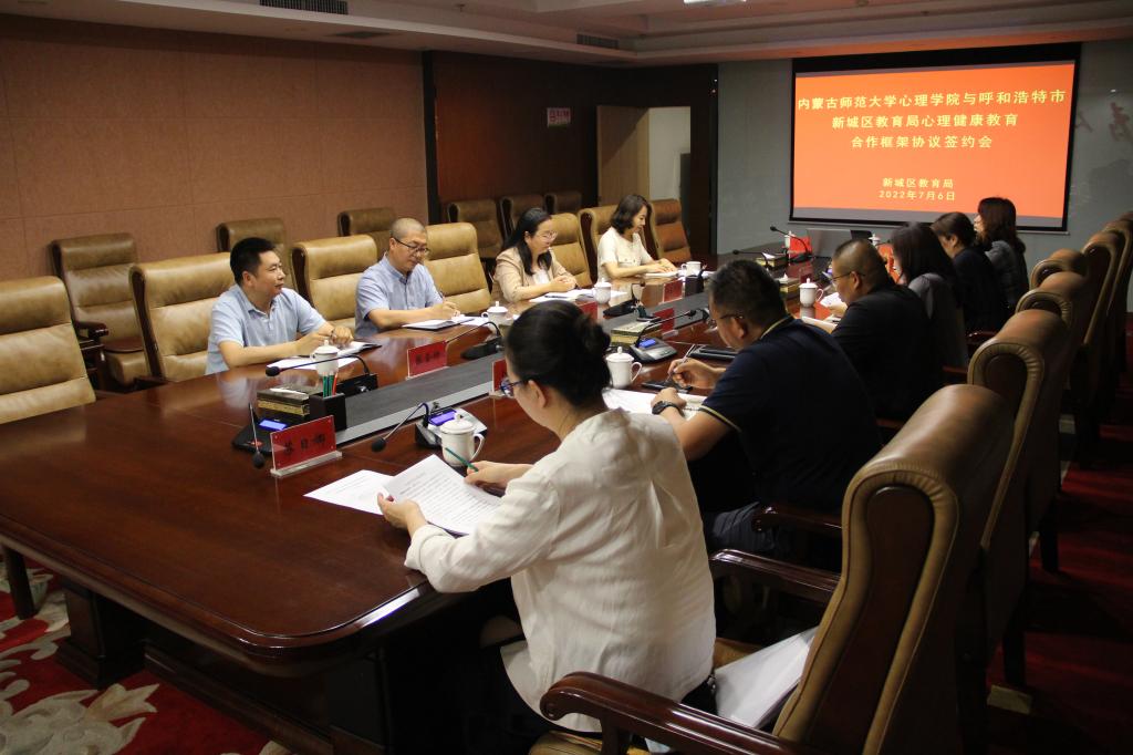 为进一步加强实践教学,提升人才培养质量,促进毕业生高质量就业,发挥学科专业优势,助力社会心理服务体系建设,7月6日下午,beat365官网与新城区教育局心理健康教育合作框架协议签约暨beat365正版唯一官网必一教育实践与就业基地挂牌仪式隆重举行。新城区教育局党组书记、局长黄咏梅,新城区教育局副局长商辉、郝素兰、卜二军,新城区教育局机关纪委书记武爱珍;beat365正版唯一官网必一院长乌云特娜,院党委副书记、副院长张晓阳,心理学系系主任杨晓峰,学生工作与就业办公室主任张金钟等参加会议。