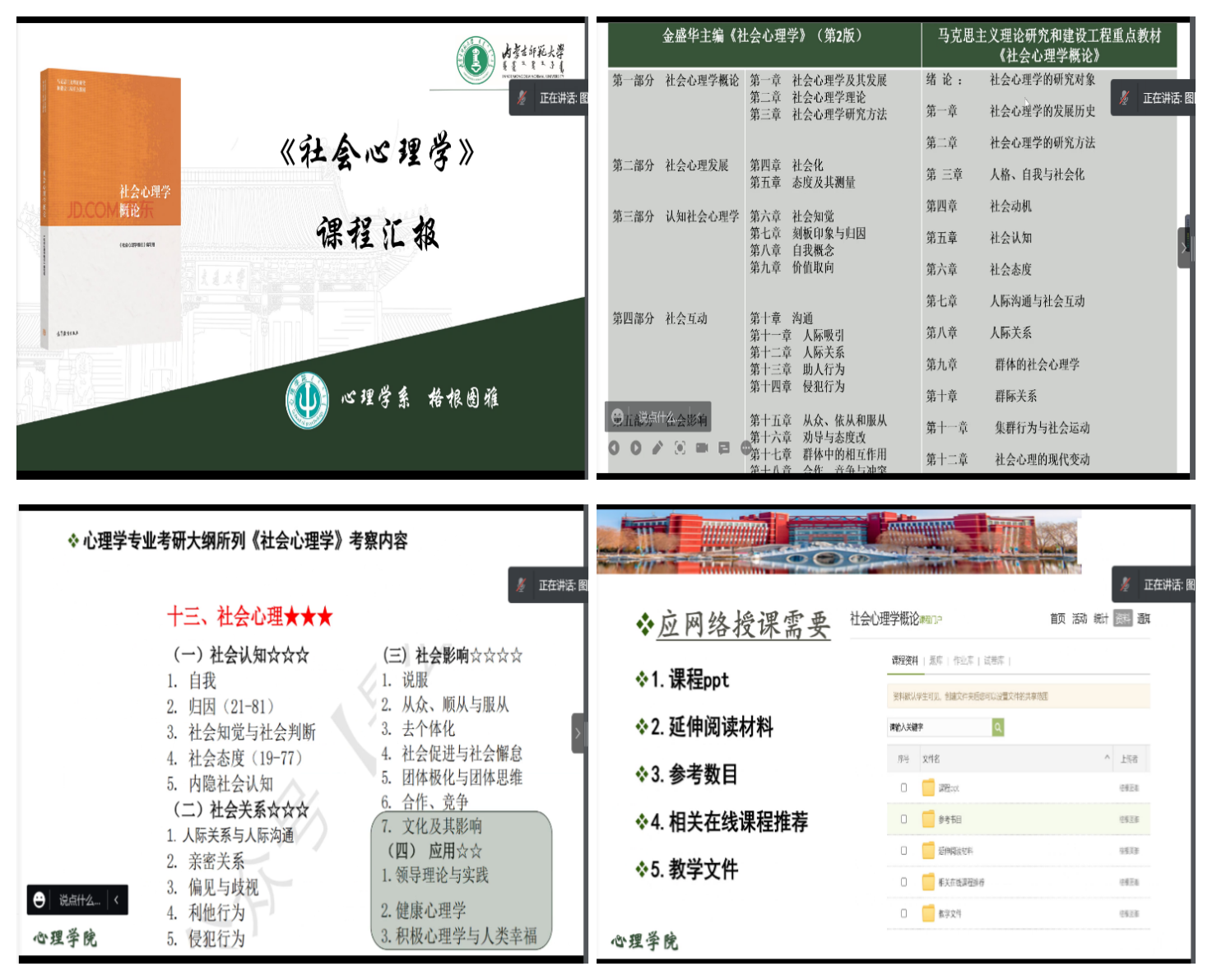 格根图雅从教材解析、考研大纲解读、一流课程建设与网络授课等几方面对《社会心理学》的课程建设进行了交流分享。介绍了《社会心理学》目前所用的马克思主义理论研究和建设工程重点教材从内容上产生了很大的变化,更加突出了思想性和文化性。着重分析了心理学考研大纲中从社会认知、社会关系、社会影响及应用等四个方面考察《社会心理学》重点内容。为了适应新教材和一流课程建设需要,课程团队修订了课程大纲、建设题库、制作课件、教案、教学日历,制定了教学计划,丰富了课程资源。