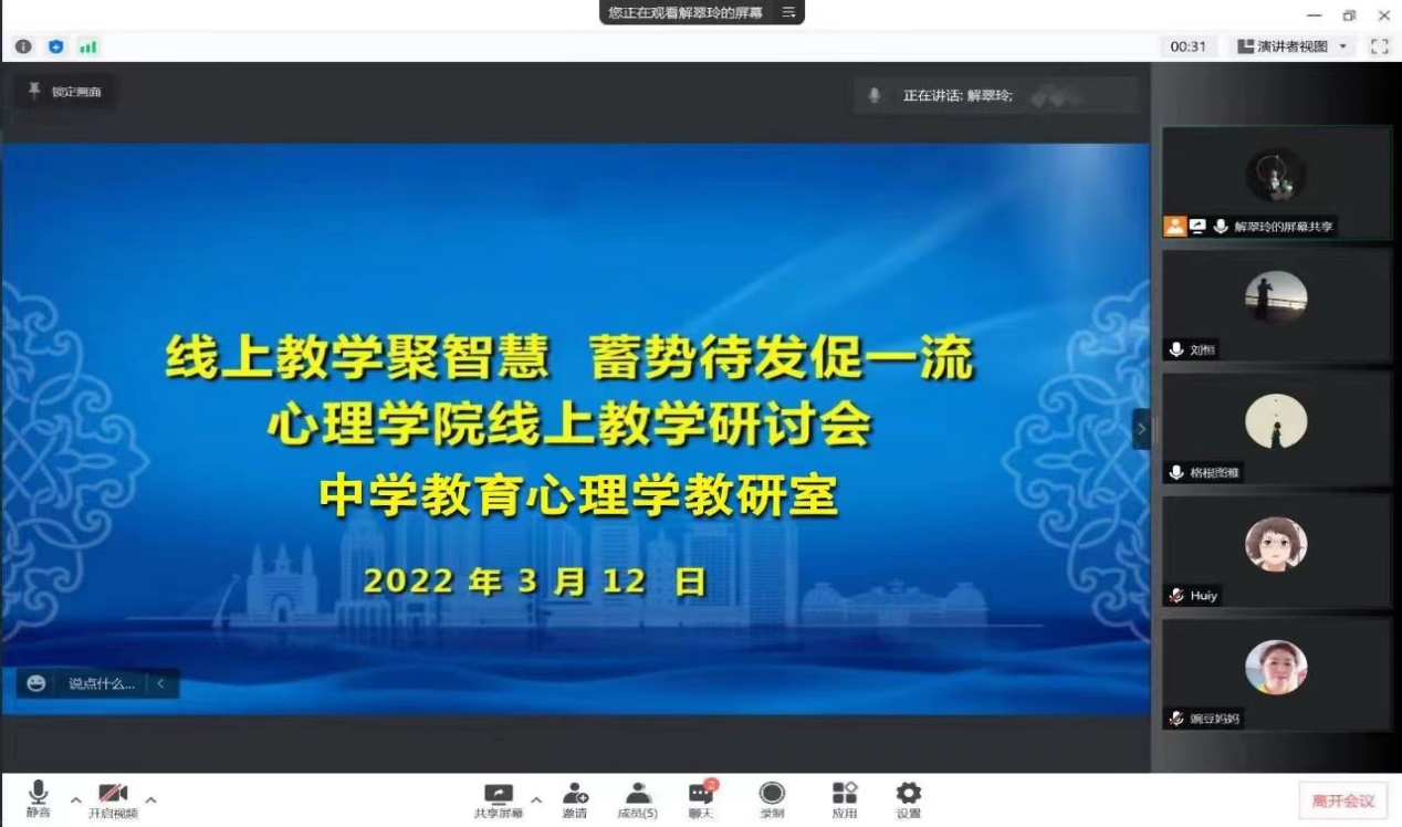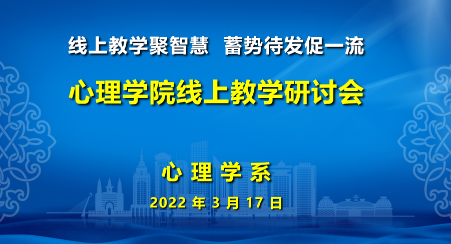 为进一步加强beat365官网线上教学组织管理工作,全力保障线上教学质量,按照学校相关要求,3月12日-17日,学院心理学系、中学教育心理学教研室和职业教育心理学教研室分别以“线上教学聚智慧,蓄势待发促一流”为主题召开了线上教学工作交流研讨会。